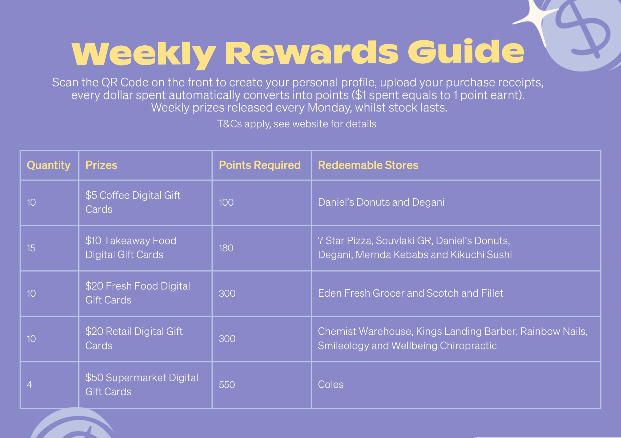 Choose from a fantastic selection of prizes, including delicious coffees, convenient gift cards, delightful lunches, and much more, all redeemable right here in the centre.